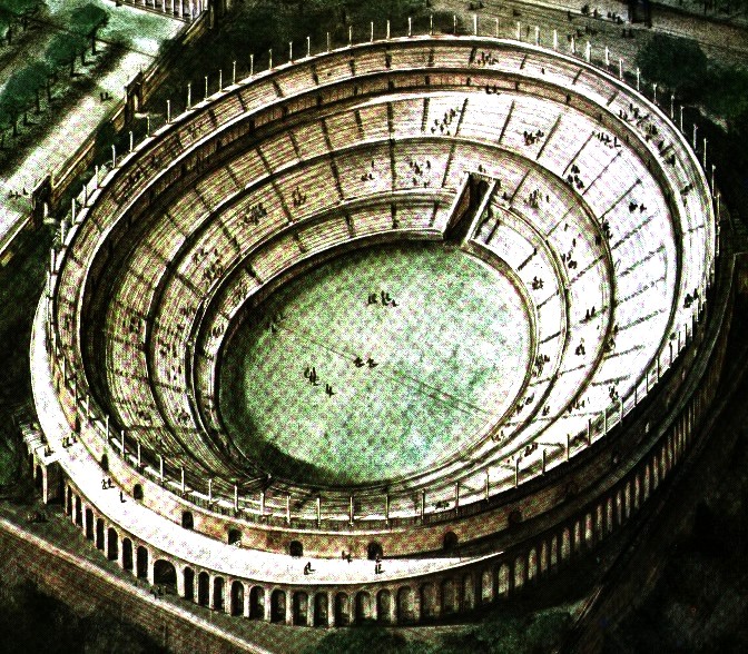 Here we can see an artist's interpretation of what the amphitheater would have been like in Pompeii.