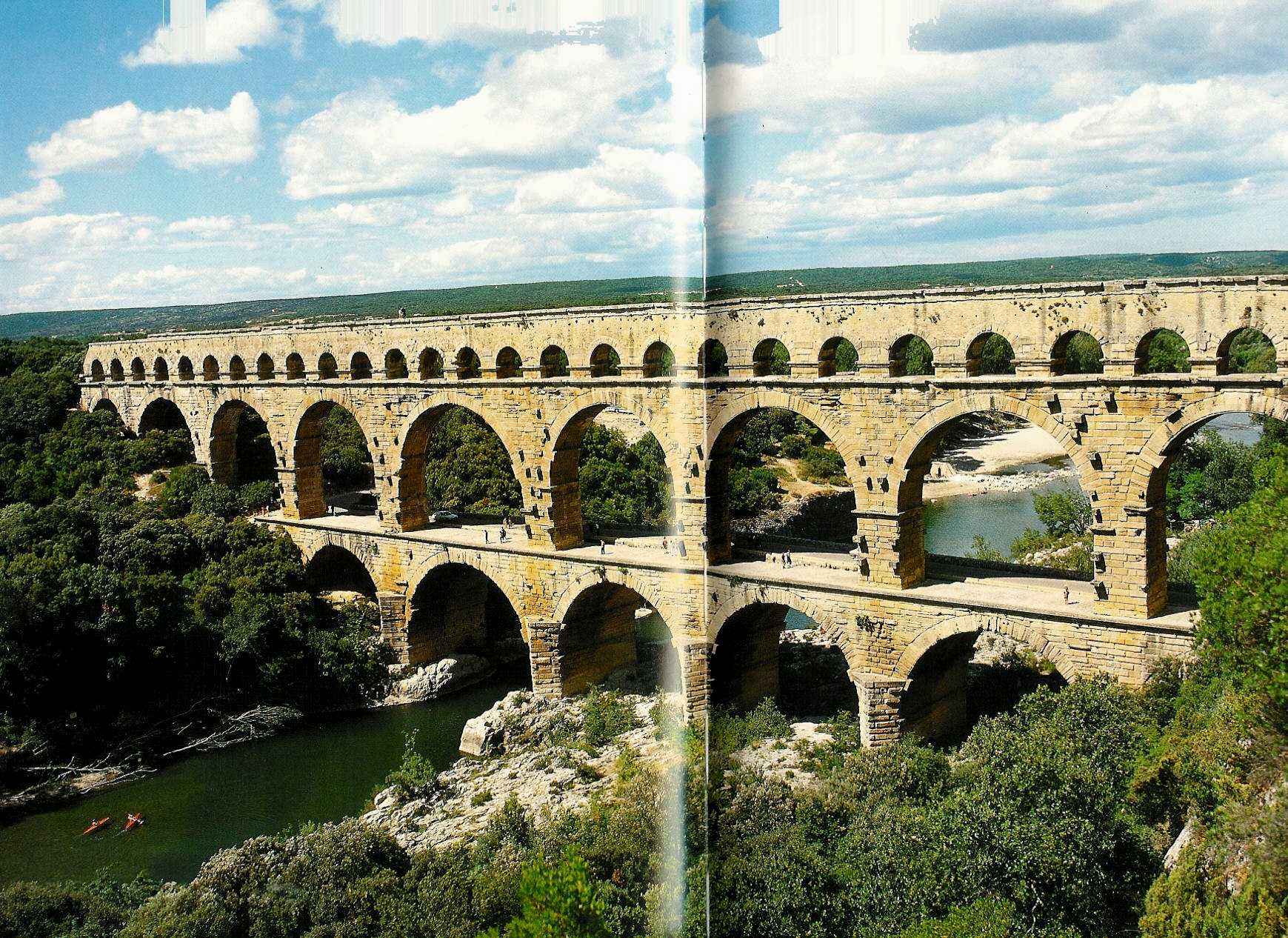 This is a picture of a Roman aqueduct. It is called the Pont du Gard and is found near Nimes, France.